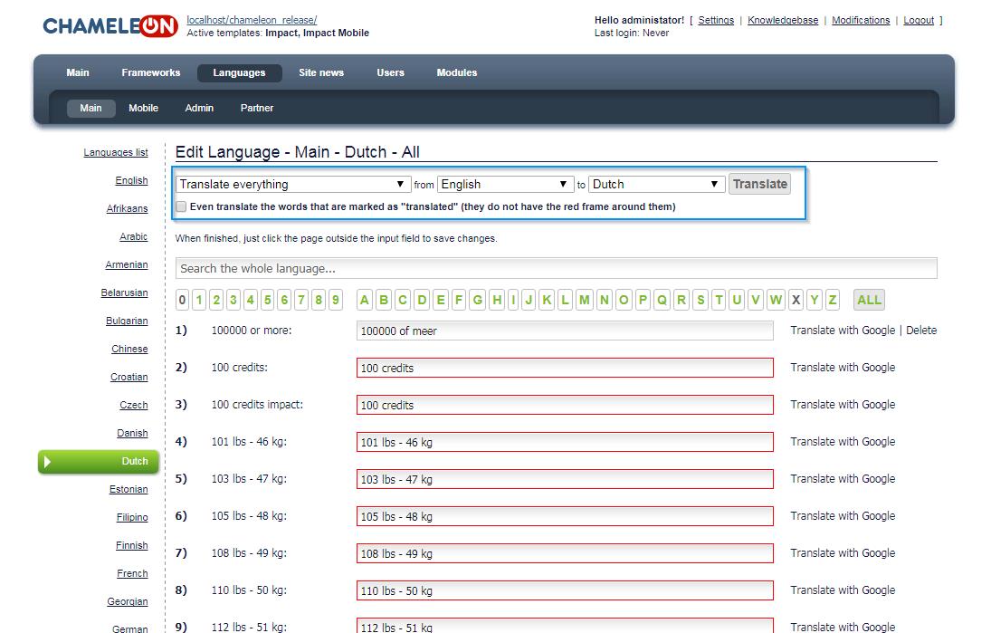 There are about 50 languages already installed in the package, but you can also add your own languages, just translating the website phrase by phrase. It usually takes about 3 hours to translate it to your language.
